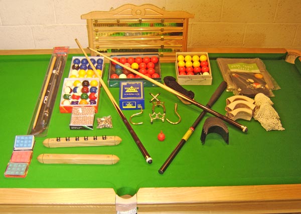 pockets, chalk, tips, pool cues, snooker cues and extensions,